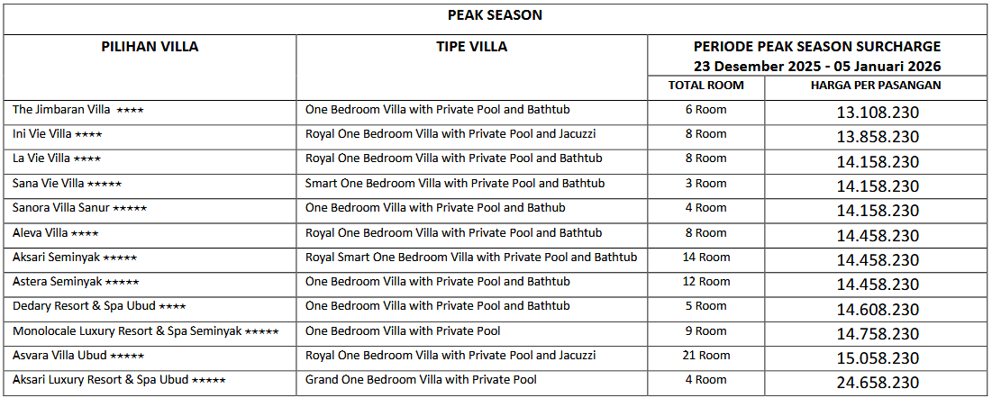 HARGA PER PASANGAN PEAK SEASON ( 2 Peserta )